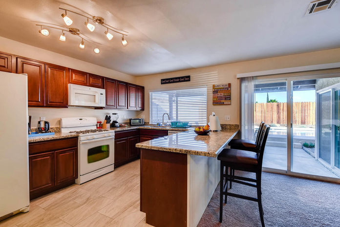 Located only 15-20 minutes from the Strip and Old Downtown Las Vegas, this home boasts a heated pool and a nice open layout living area. The kitchen is fully stocked with cookware and dishware, there is a BBQ grill in the backyard, and plenty of room for everyone.